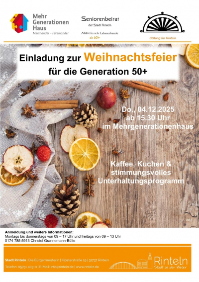 Seniorenbeirat, Stiftung für Rinteln und „Generation 50+“ laden zur Weihnachtsfeier ein