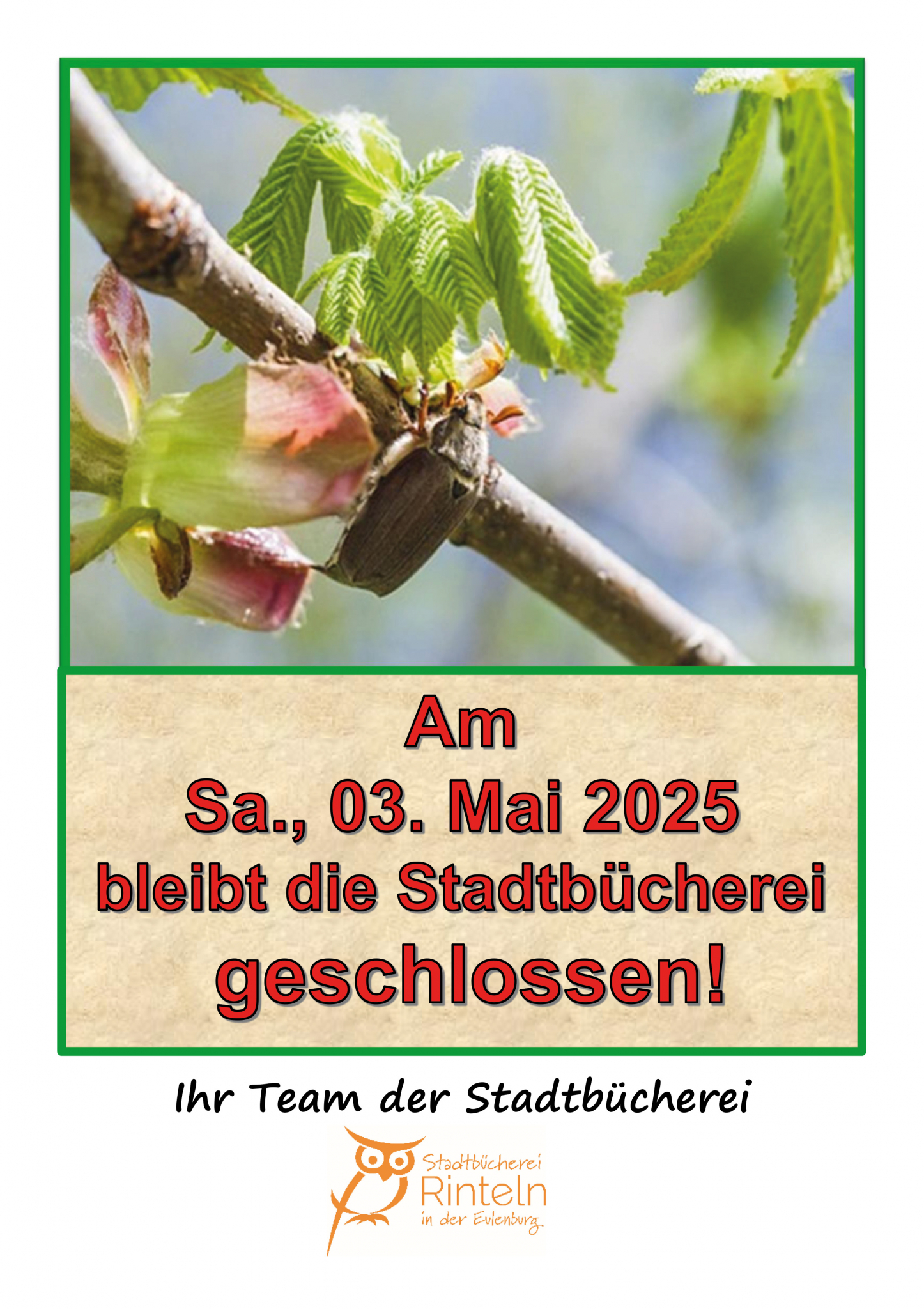 Am Samstag, den 3. Mai, bleibt die Stadtbücherei Rinteln geschlossen. Ab Montag, den 5. Mai, ist die Bücherei zu den gewohnten Zeiten wieder geöffnet.