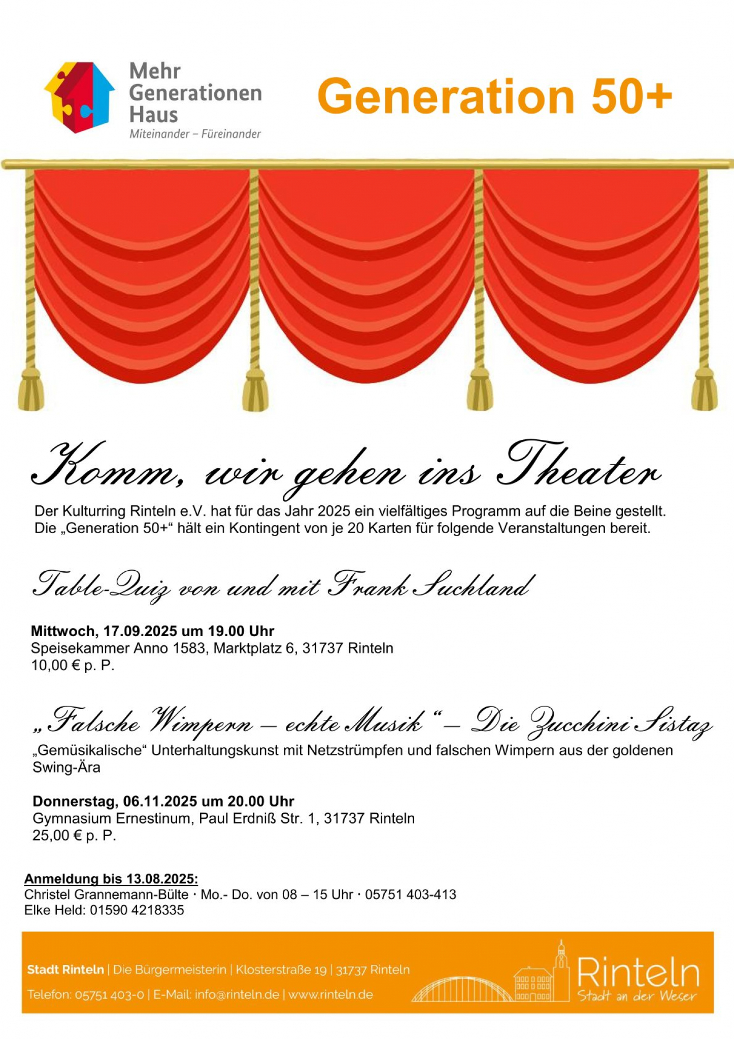 Der Kulturring Rinteln e.V. hat für das Jahr 2025 ein vielfältiges Programm auf die Beine gestellt. Die „Generation 50+“ hält ein Kontingent von je 20 Karten für folgende Veranstaltungen bereit.