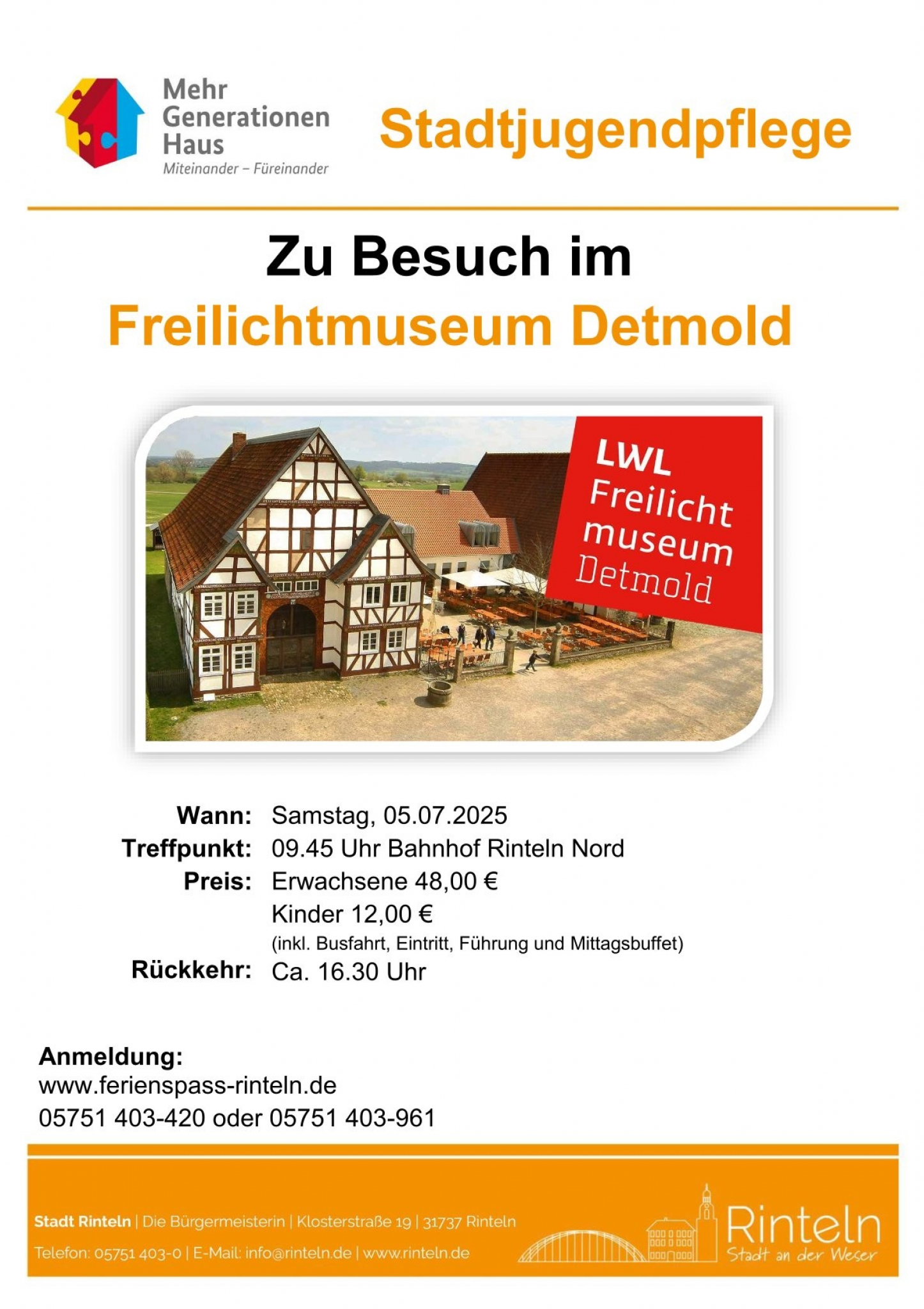 Die Stadtjugendpflege fährt im Rahmen des Sommerferienspaßes gemeinsam mit der „Generation 50+“ ins Freilichtmuseum nach Detmold. Verbringt einen schönen Tag mit Freunden und Familie auf dem weitläufigen Gelände mit historischen Gebäuden umgeben von herrlicher Natur.
