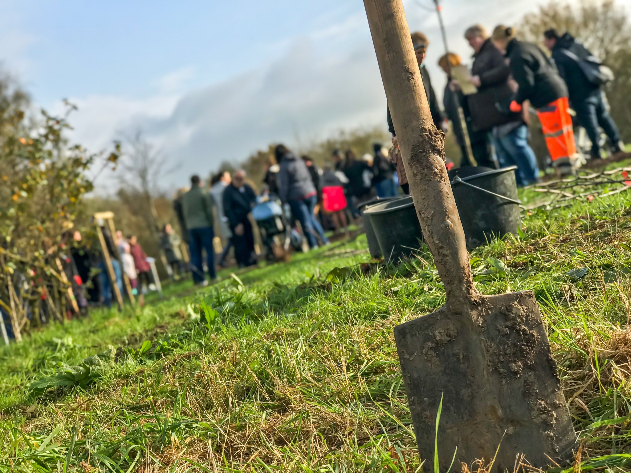 Zu diesem Zeitpunkt wird das Pflanzloch ausgehoben und zwei Pflanzstäbe fachgerecht eingesetzt sein. Dennoch sollten Sie einen Spaten mitbringen, um das Pflanzloch nach dem Einsetzen des Baumes wieder zu füllen und den Trägerstab des Namensschildes einzugraben.Dann gilt es noch, den Baumstamm an den Pflanzstäben anzubinden und die Namensplakette zu befestigen.