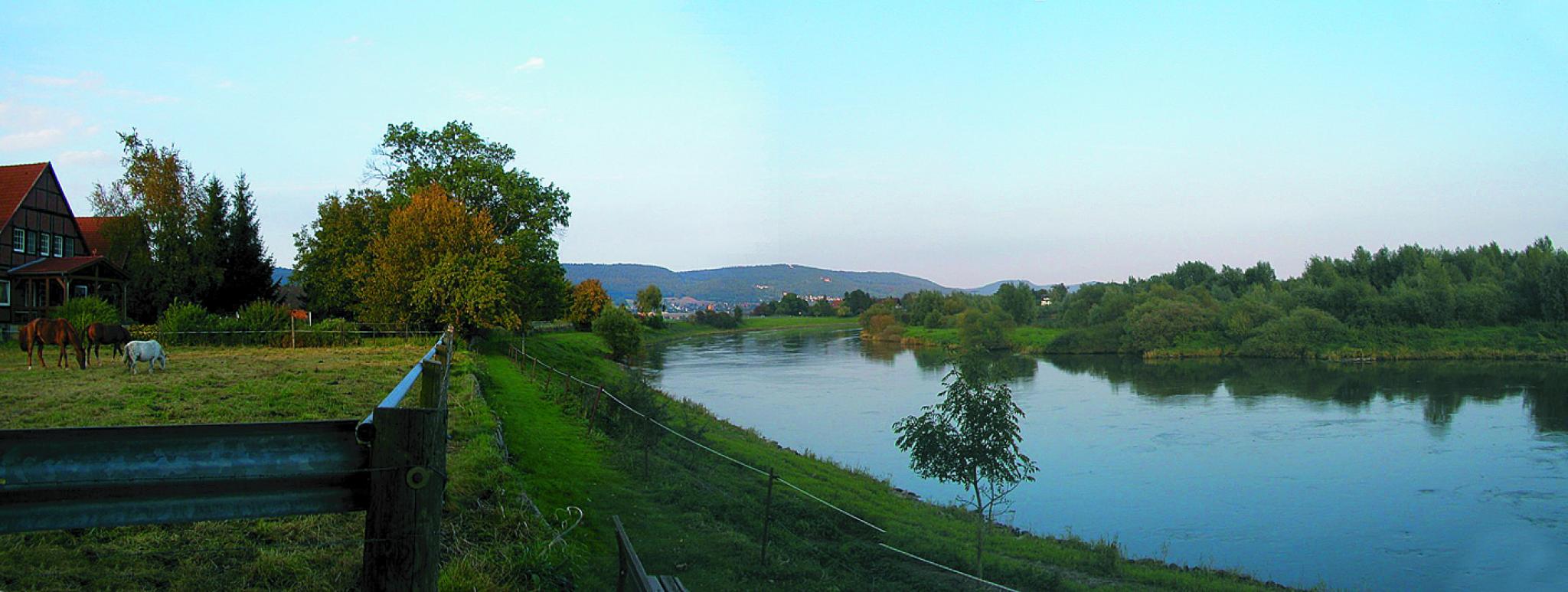 Die bis heute gebräuchliche Bezeichnung des Dorfes „In der Ahe" verweist auf die besondere Lage des Ortes unmittelbar „in der Aue" und kaum ein anderer Ort zwischen Hameln und Minden ist so eng mit der Weser verbunden. Anders als vergleichbare Orte am Fluss liegt es nicht auf einer erhöhten Talsandinsel und hat daher in der Vergangenheit besonders häufig und schwer unter den Hochwassern der Weser zu leiden gehabt. Überdies ist der Fluss, der den Ort mit seinem Prallhang berührt, im Laufe der Jahrhunderte durch Abspülungen immer näher an den Kern der Siedlung herangerückt.