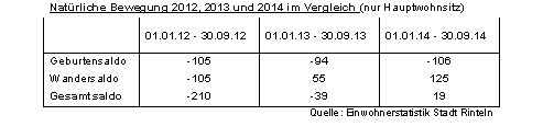 In den ersten neun Monaten des Jahres 2012 ist die Zahl der Zugezogenen geringer als die der Weggezogenen. Der Wandersaldo liegt bei -105. Für den gleichen Zeitraum in 2013 ist die Zahl der neuen Bürgerinnen und Bürger schon größer als die der Verzogenen. Das drückt der positive Wandersaldo von 55 aus. Eine Entwicklung, die mit einem positiven Wandersaldo von 125 in 2014 weiter zu beobachten ist.