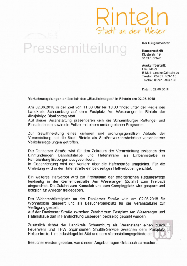 Verkehrsregelungen anlässlich des "Blaulichttages" in Rinteln am 02.06.2018