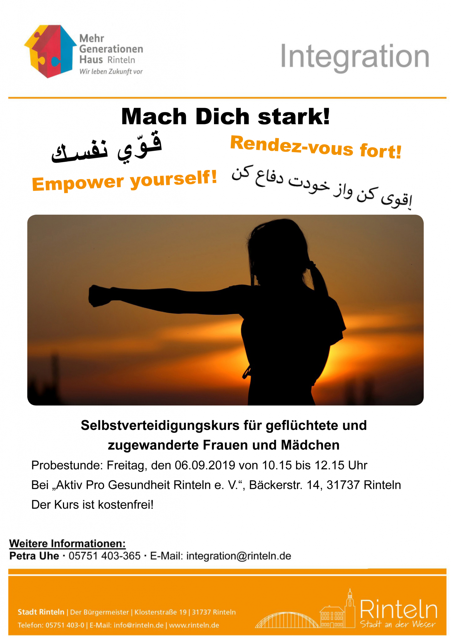 Alle zugewanderten und geflüchteten Frauen sind von der Integrationsbeauftragten der Stadt Rinteln herzlich eingeladen, an einem kostenlosen Kurs zur eigenen Stärkung und Verteidigung teilzunehmen.