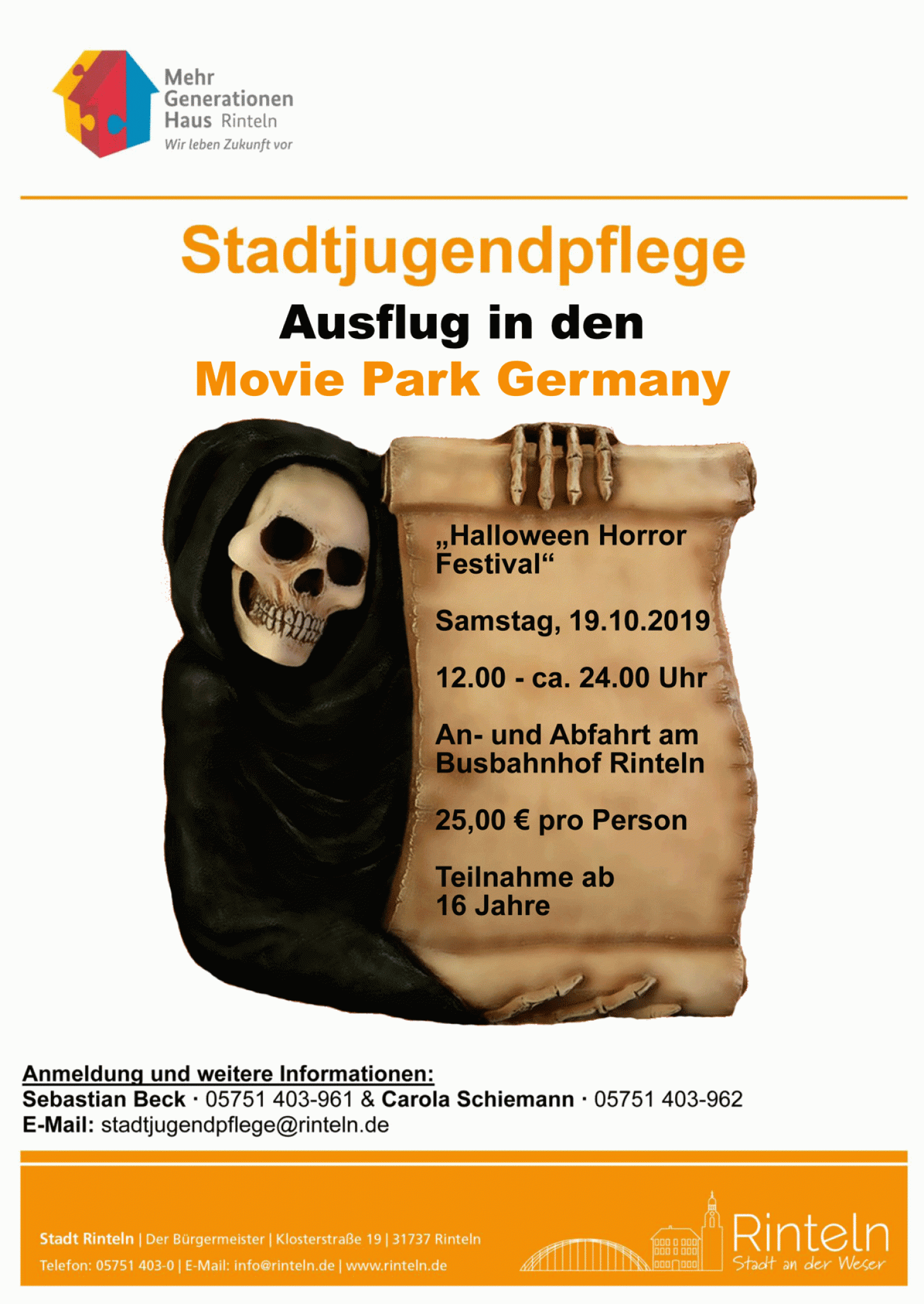 Die Stadtjugendpflege Rinteln lädt alle Gruselfans ab 16 Jahre ein, die bevorstehende Halloweennacht angemessen zu feiern. Es geht in den Movie Park Germany, der zum mittlerweile 21. Mal das „Halloween Horror Festival“ veranstaltet.