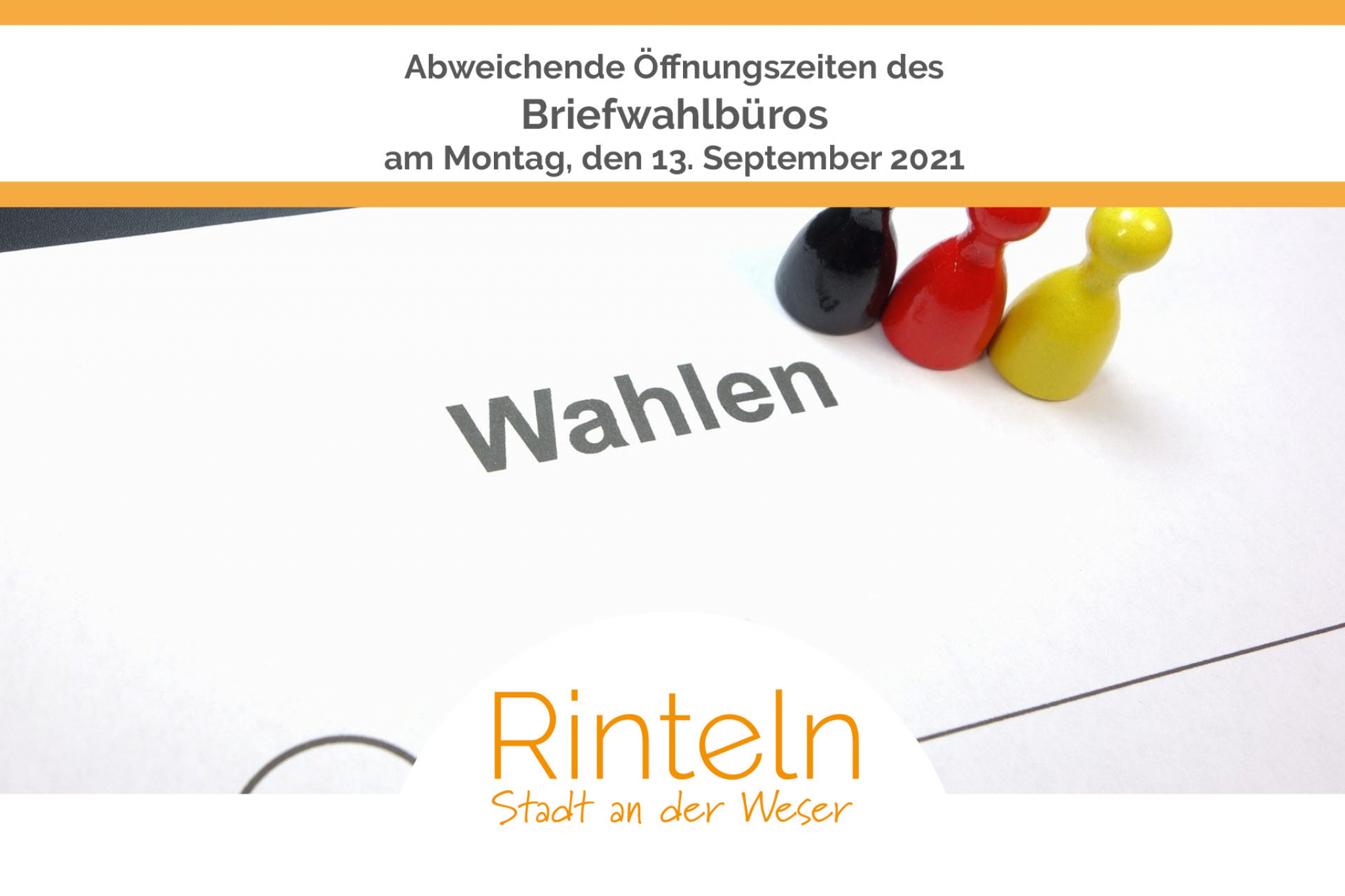 Aus organisatorischen Gründen ist das Briefwahlbüro der Stadt Rinteln im Sitzungssaal der Klosterstraße 20, 31737 Rinteln, 5. OG, Zi.-Nr. 535 am Montag, den 13. September 2021 erst ab 9:00 Uhr geöffnet. Unsere Mitarbeiterinnen und Mitarbeiter stehen Ihnen dann wie üblich bis 12:30 und von 13:30 bis 15:30 Uhr zur Verfügung. Wir bitten um Ihr Verständnis.