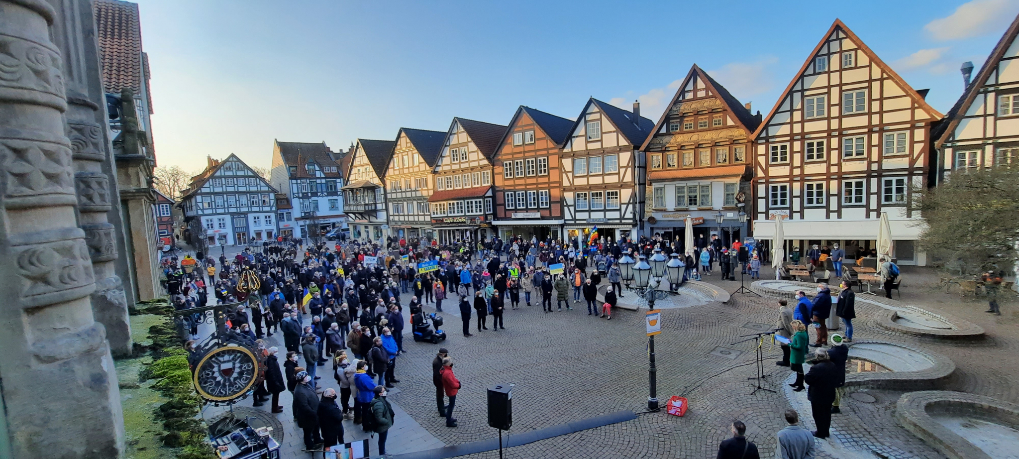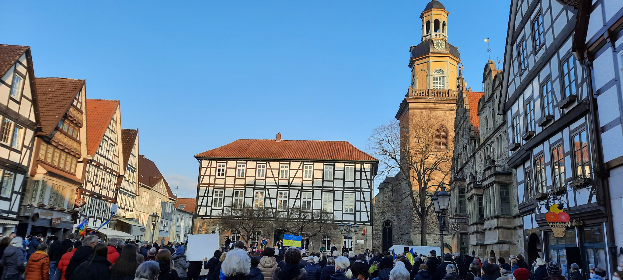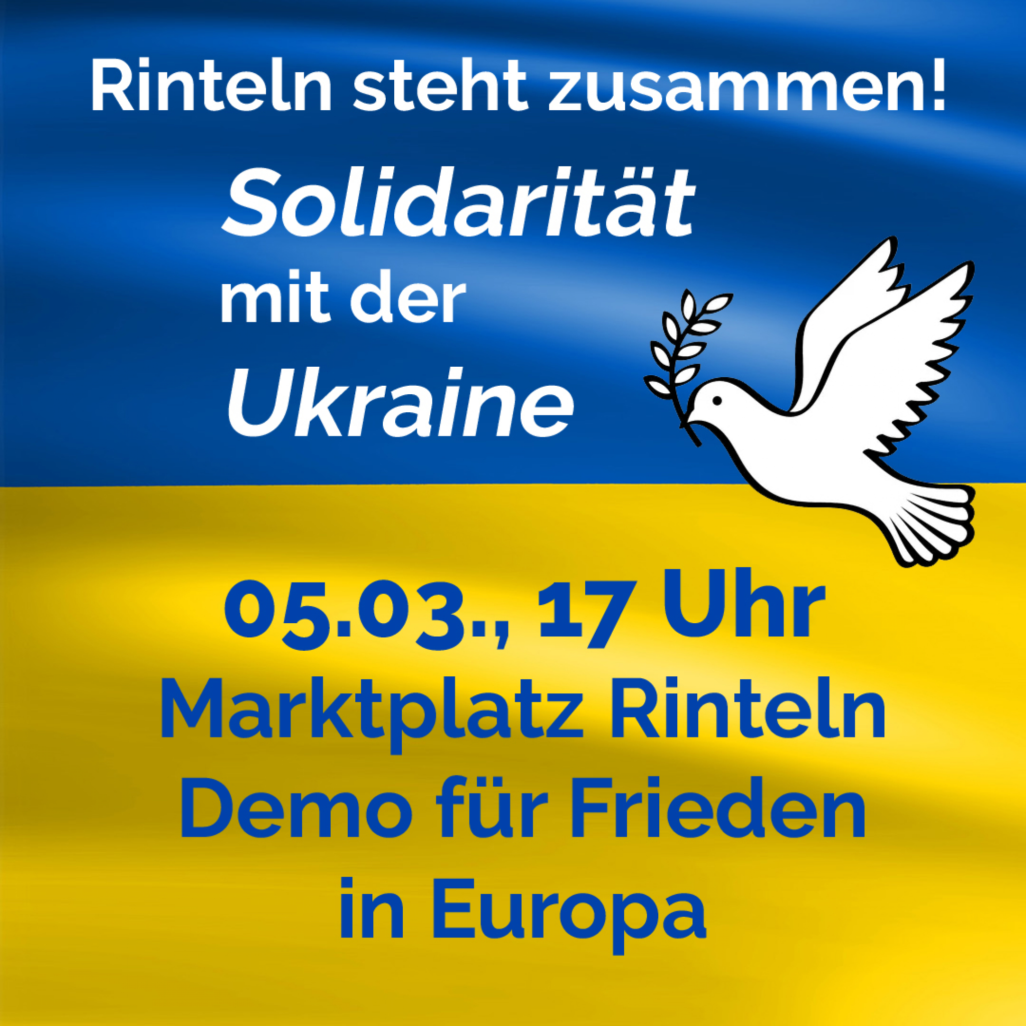 Unter dem Motto "Rinteln steht zusammen - SOLIDARITÄT mit der UKRAINE!" lädt ein breites Bündnis aus Kirche, Politik und Verwaltung zu einer Friedensdemo auf dem Marktplatz in Rinteln ein.