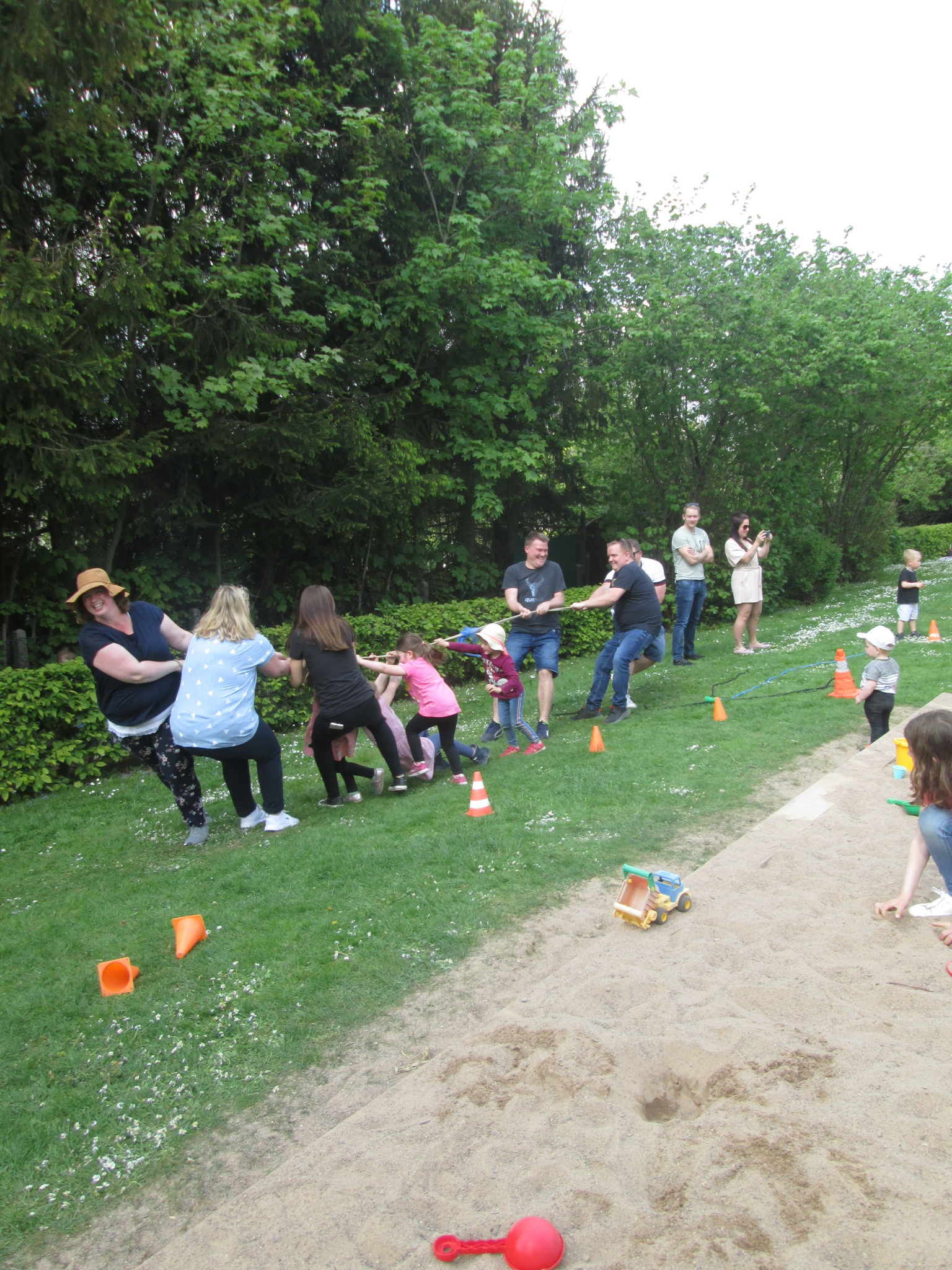 Danach konnten die Kinder mit ihren Eltern an die, von den Fachkräften vorbereiteten Stationen, wie Luftballon-Dart, Eierlauf, Seifenblasen, Dosenwerfen und vieles mehr. Die gemeinsamen Kräfte wurden beim Tauziehen gemessen. Besonders spannend waren auch der Dreibeinlauf und das Schaumkusswettessen.