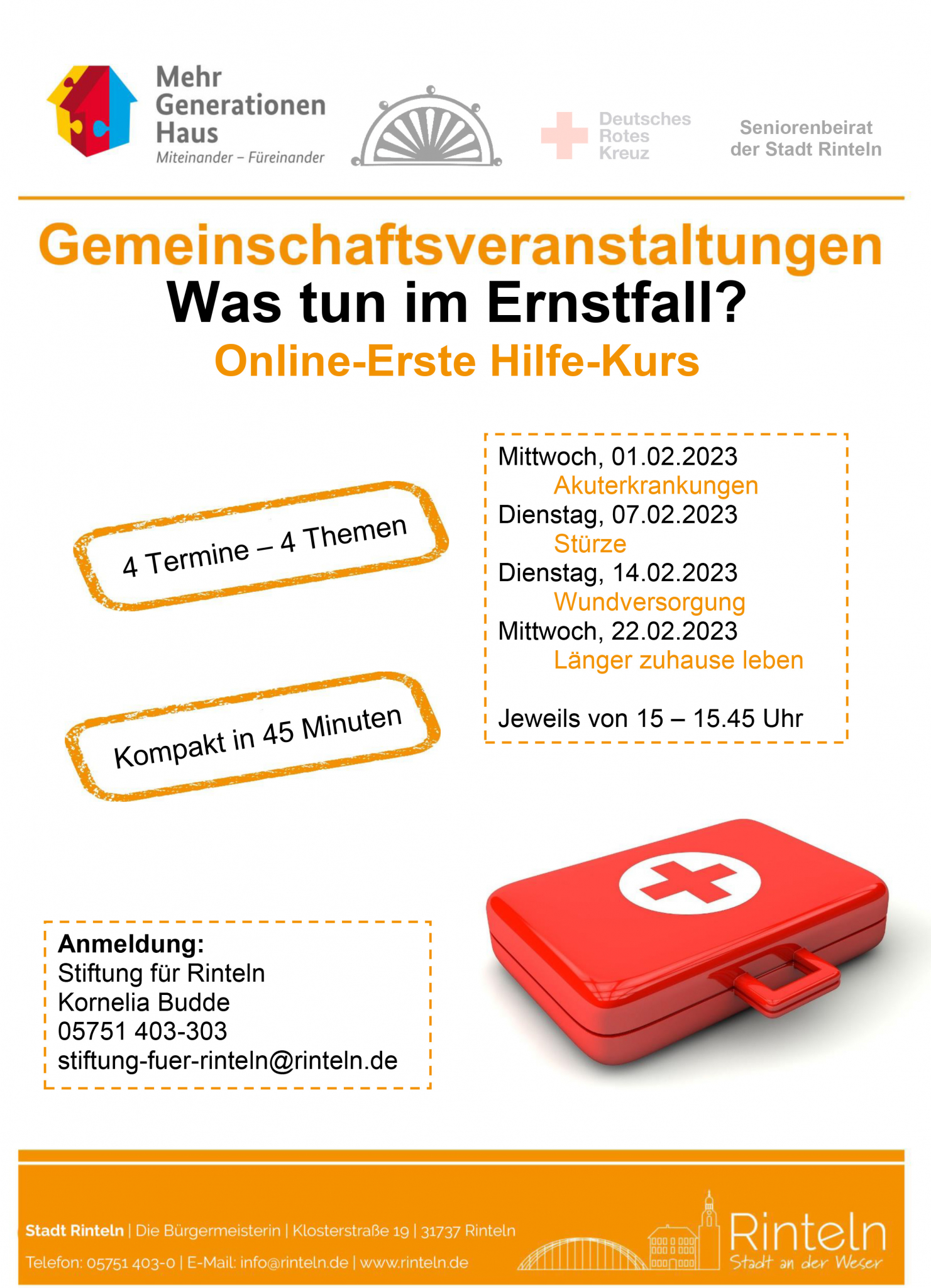 Das Mehrgenerationenhaus, die Stiftung der Stadt Rinteln sowie der Seniorenbeirat der Stadt Rinteln laden zum kostenlosen Online-Erste-Hilfe-Kurs ein.