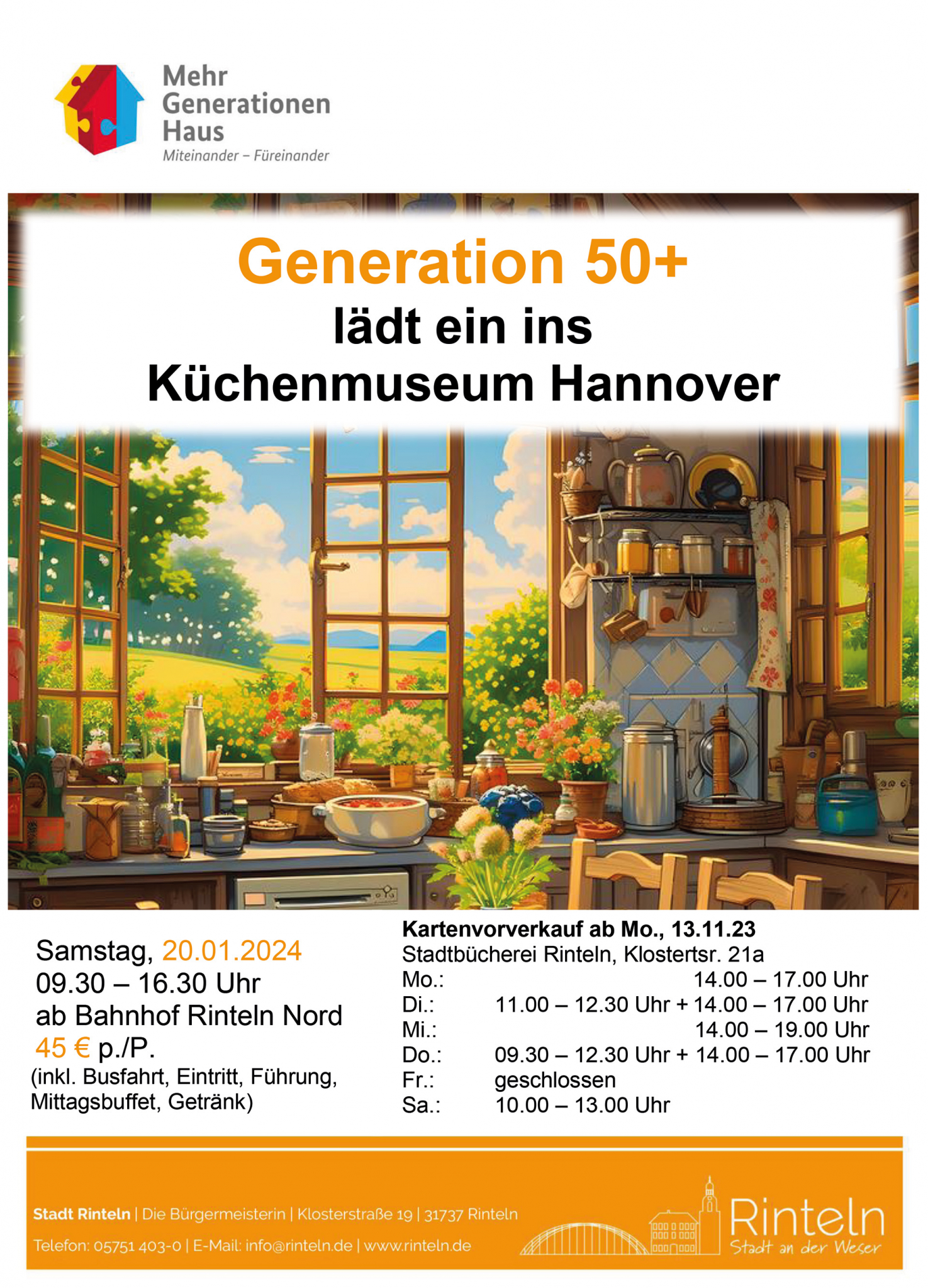 Die „Generation 50+“ lädt ein zu einer Premiumführung durch die „World Of Kitchen“-Ausstellung in Hannover. Dort werden Küchen aus verschiedensten Ländern und Epochen in liebevoller Kleinarbeit gesammelt und für Interessierte ausgestellt.