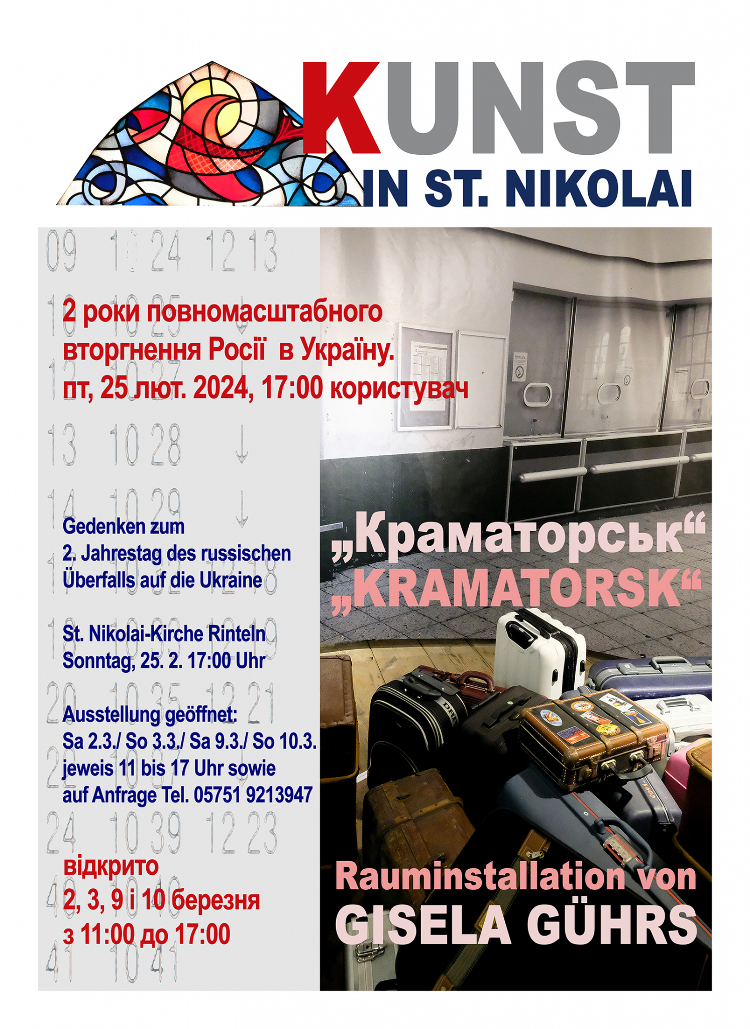 Gemeinsam mit der Stadt Rinteln, der Superintendentur des Kirchenkreises Grafschaft Schaumburg und der Künstlerin Gisela Gührs erinnert die St. Nikolai Gemeinde Rinteln an diesem Wochenende an den Jahrestag des Überfalls und setzt am Sonntag, 25. Februar mit einer besonderen Gedenkveranstaltung und Vernissage ein Zeichen der Verbundenheit und Solidarität mit den Opfern des Krieges. Die Veranstaltung beginnt um 17.00 Uhr in der St. Nikolai Kirche.
