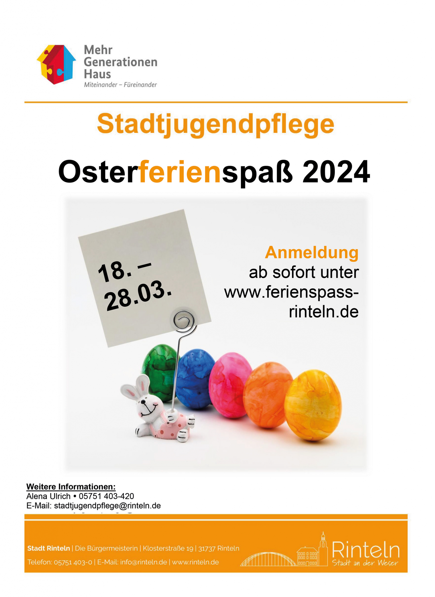Ergänzend zu den Ferienbetreuungsangeboten an den Grundschulen bietet die Stadtjugendpflege den Osterferienspaß für Kinder und Jugendliche ab 10 Jahre an.