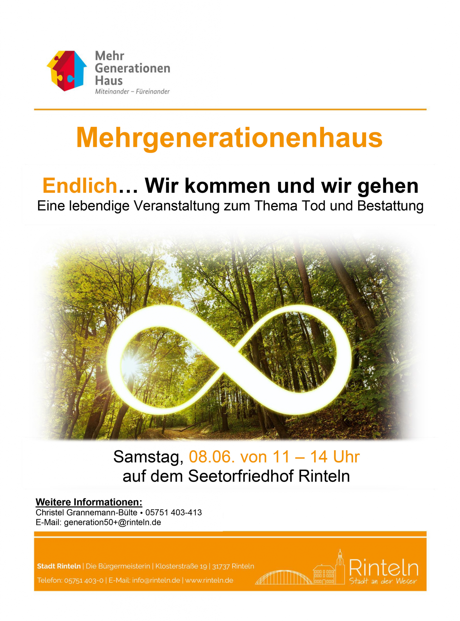 Am Samstag, den 08.06.2024 laden das Mehrgenerationenhaus und der Bereich „Friedhofswesen“ der Stadt Rinteln zu einem lebendigen Austausch zum Thema „Tod und Bestattung“ auf den Seetorfriedhof ein. Unterstützt wird die Veranstaltung vom Hospizverein Rinteln e. V., Bestattungen Kampmeier, Bestatter Friedrich Bartram, Trauerrednerin Marion Windisch sowie Paul-Egon Mense und Ursula Mühlenhoff, die für ein humorvolles Rahmenprogramm sorgen werden.