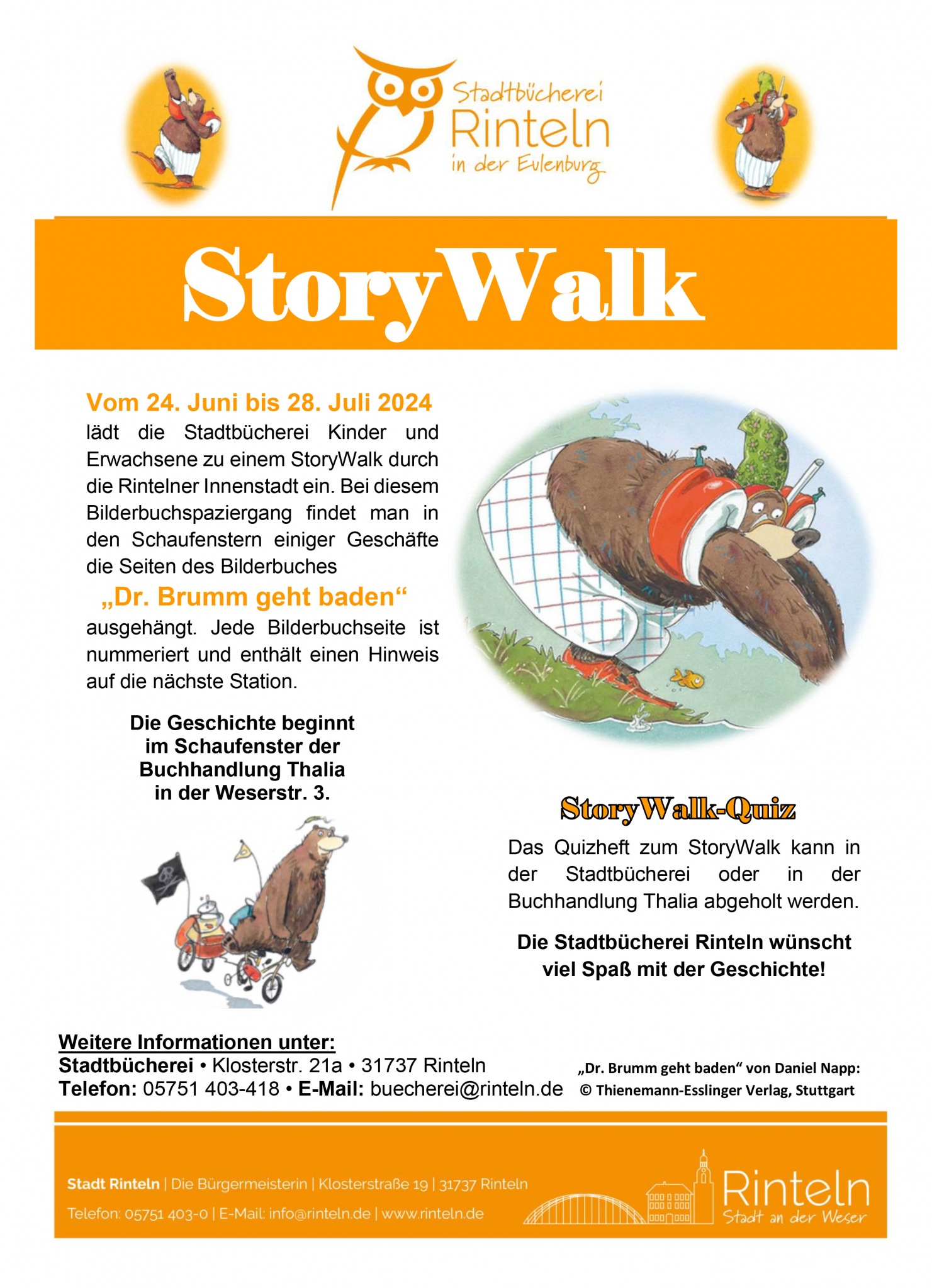 Die Stadtbücherei lädt zum dritten StoryWalk durch die Rintelner Innenstadt ein. Die Idee, die dahintersteckt, ist eine Leseförderung „im Vorbeigehen“, denn bei diesem Spaziergang besteht die Möglichkeit, das Bilderbuch regelrecht zu erlesen und zu entdecken. Bei diesem Bilderbuchspaziergang findet man in den Schaufenstern von zwölf unterschiedlichen Geschäften die Geschichte »Dr. Brumm geht baden« von Daniel Napp ausgehängt. Eine turbulente Bilderbuchgeschichte für Kinder ab 4 Jahren.