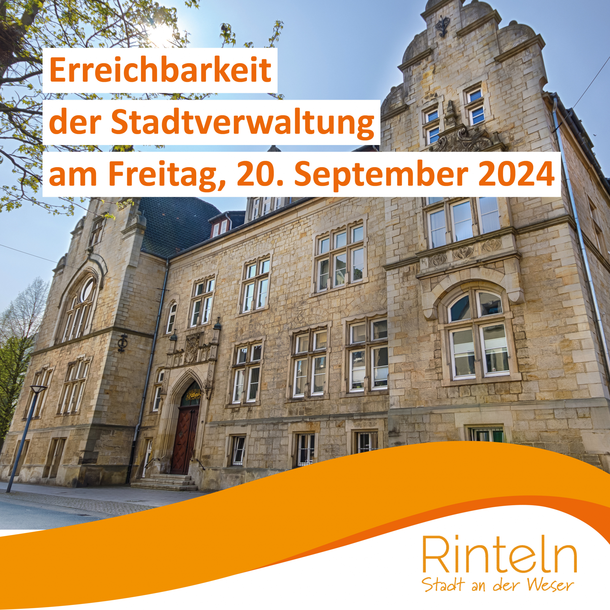 Wegen einer Personalveranstaltung sind am Freitag, dem 20. September 2024, die Dienststellen und Ämter der Stadtverwaltung Rinteln nicht oder nur eingeschränkt erreichbar. Das Bürgerbüro ist für den Publikumsverkehr geschlossen. In besonders dringenden und unaufschiebbaren Angelegenheiten kann das Bürgerbüro von 09.00 bis 12.00 Uhr unter der Telefonnummer 4030 kontaktiert werden.