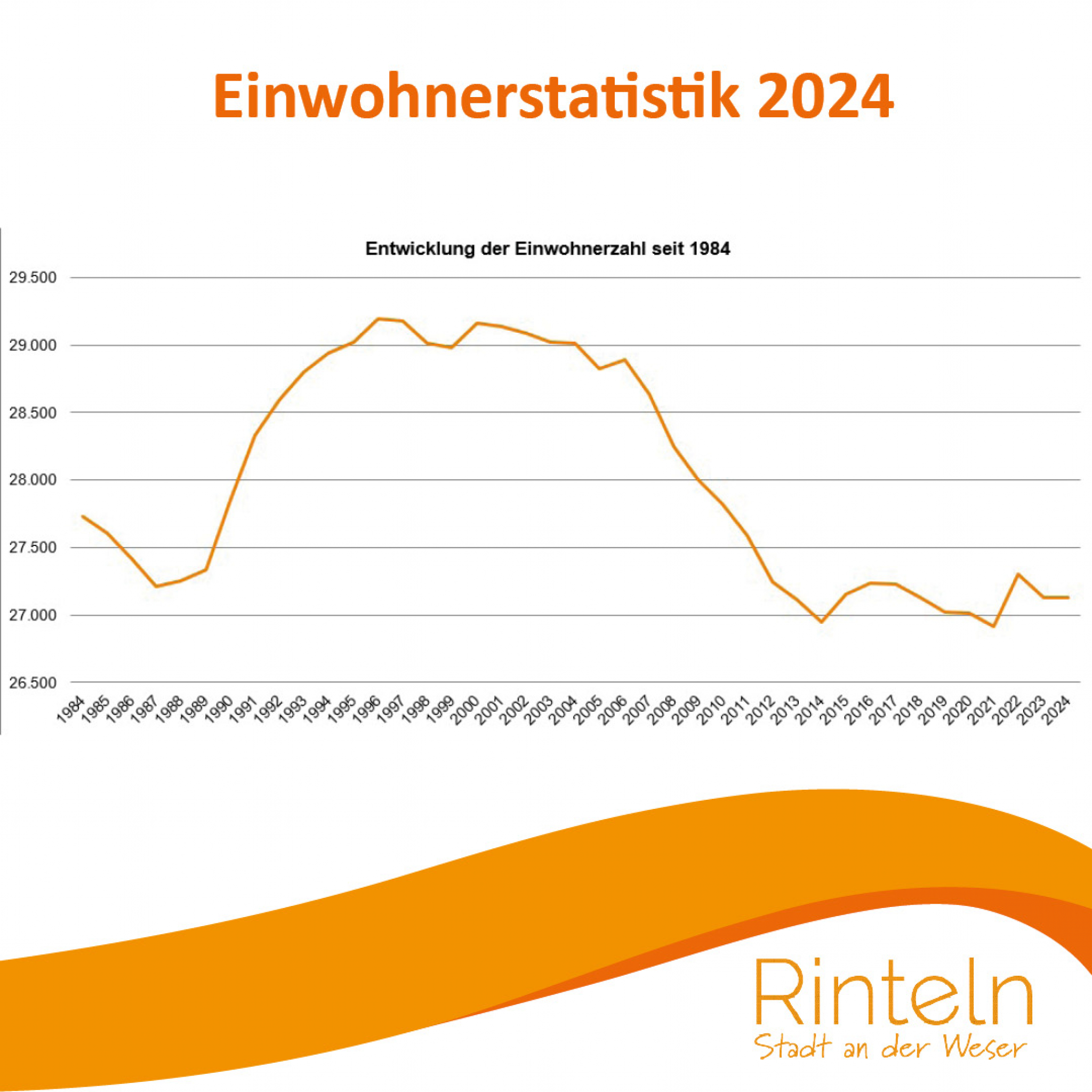 Aus den Zahlen des städtischen Einwohnermeldeamtes geht hervor, dass zum Stichtag 31.12.2024 in der Stadt Rinteln 27.127 Einwohnerinnen und Einwohner mit Haupt- und Nebenwohnsitz gemeldet waren. Gegenüber dem Bestandsjahr 2023 ist die Einwohnerzahl um gut 0,02 % gesunken.