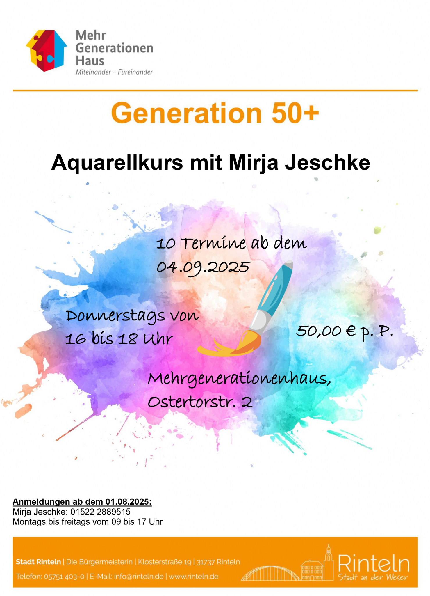 Kreativität kennt kein Alter! Farben fließen und die Seele baumeln lassen und nebenbei die eigene Kreativität (neu) entdecken. All das und vieles mehr bietet der Aquarellkurs für die „Generation 50+“, der am 04.09.2025 im Mehrgenerationenhaus Rinteln startet. Der Kurs richtet sich an alle, die Lust aufs Malen haben – Vorkenntnisse sind nicht erforderlich. Gestalten Sie Schritt für Schritt Ihre eigenen kleinen Kunstwerke.