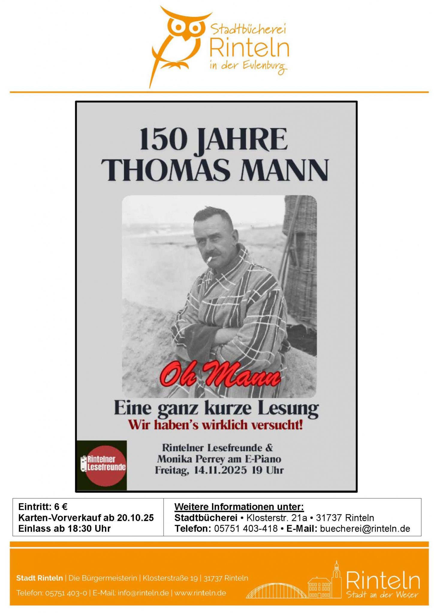Unter diesem ungewöhnlichen Motto gestalten die Rintelner Lesefreunde am Freitag, den 14.11.2025 um 19 Uhr eine Thomas Mann Lesung in der Stadtbücherei Rinteln.