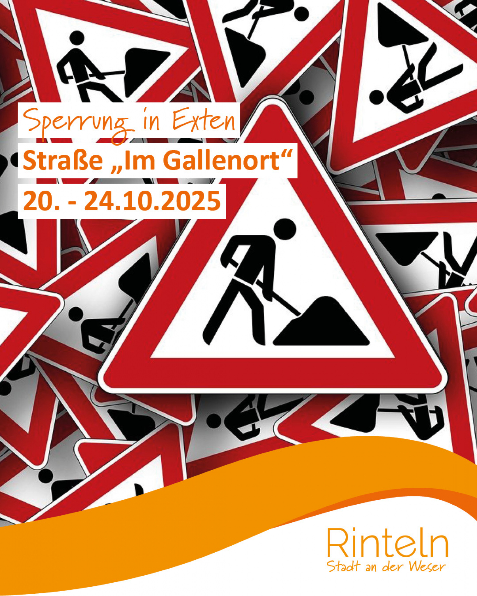 Ab dem 20.10.2025 bis voraussichtlich 24.10.2025 ist eine Durchfahrt der Straße „Im Gallenort“ im Ortsteil Exten aufgrund von Straßenbauarbeiten (Sanierung der gepflasterten Einengung) zwischen der Einmündung Feuerwehr/Festplatz und Orangerie nicht möglich. Eine Umleitung über die „Regetestraße“ bzw. die Straße „Am Sportplatz“ ist ausgeschildert.