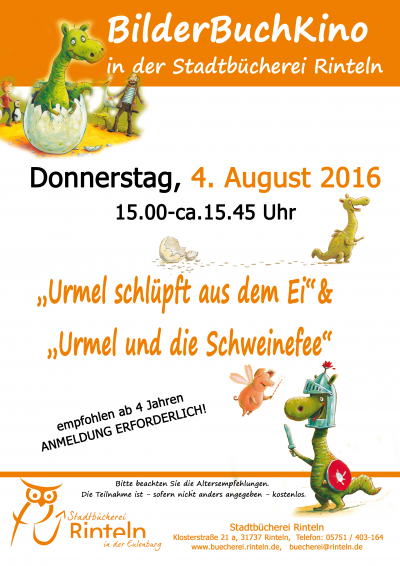 Am Donnerstag, 4. August 2016, zeigt die Stadtbücherei Rinteln in ihren Räumen in der Klosterstraße 21 a um 15 Uhr wieder zwei BilderBuchKinos. Diesmal werden zwei Geschichten um den Kinderliebling „Urmel" gelesen.