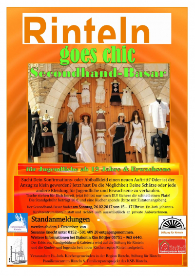 Hängt das alte Konfirmations- oder Abiballkleid im Schrank und staubt ein? Oder ist der Anzug zu klein geworden? Diese Festtagskleidung oder andere elegante Garderobe für Jugendliche und Erwachsene kann auf dem Secondhand-Basar am Sonntag, 26. Februar 2017 von 15 bis 17 Uhr im Ev.-luth. Johannis-Kirchzentrum Rinteln verkauft werden.
