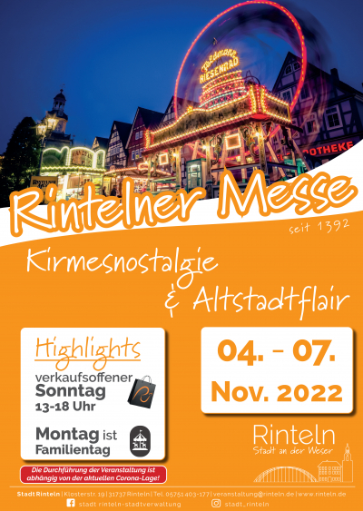 Start frei für vier tolle Kirmestage: Vom 04. bis 07. November 2022 geht es in Rinteln an der Weser wieder hoch her. Die traditionelle Herbstmesse lockt dann Besucherinnen und Besucher aus nah und fern in die historische Altstadt, die das Jahrmarktgeschehen mit ihrer unverwechselbaren Kulisse einbindet.