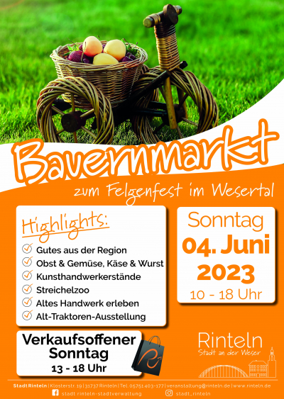 Zum Felgenfest im Wesertal verwandeln sich der Rintelner Markt- und Kirchplatz sowie die wunderschöne Fußgängerzone zu einem „Bauernmarkt“ für regionale Produkte und ländliches sowie historisches Handwerk. Im Vordergrund steht beim Rintelner Bauernmarkt die Direktvermarktung. Angeboten wird alles was die Landwirtschaft anzubieten hat: erntefrisches Obst und Gemüse, Salat, Honig, frisches Brot,...