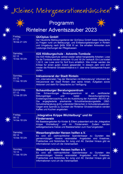 In der Zeit vom 01. bis 23. Dezember 2023 lädt das „kleine Mehrgenerationenhäuschen“ auf dem Rintelner Adventszauber mit zahlreichen Angeboten für Jung und Alt zum Informieren, Kaufen und Verweilen ein.