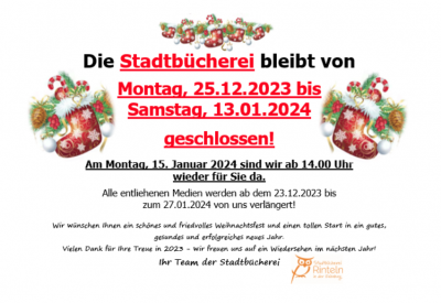 Die Stadtbücherei bleibt von Montag, 25. Dezember 2023 bis Samstag, 13. Januar 2024 geschlossen.