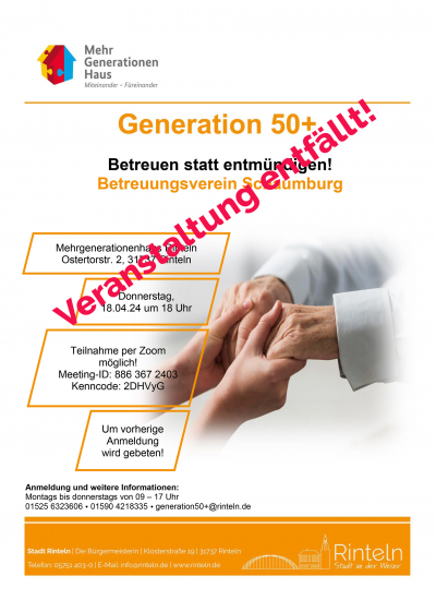 Die Veranstaltung "Betreuen statt Entmündigen" des Betreuungsvereins Schaumburg am Donnerstag, 18.04.2024, im Mehrgenerationenhaus Rinteln entfällt!