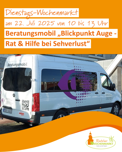 Am kommenden Dienstag, 22. Juli 2025 in der Zeit von 10 bis 13 Uhr wird das Beratungsmobil von „Blickpunkt Auge – Rat und Hilfe bei Sehverlust“ auf dem Wochenmarkt vertreten sein und Interessierte kostenlos zu den verschiedensten Themen rund um Augenerkrankungen informieren, beraten und unterstützen.